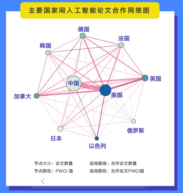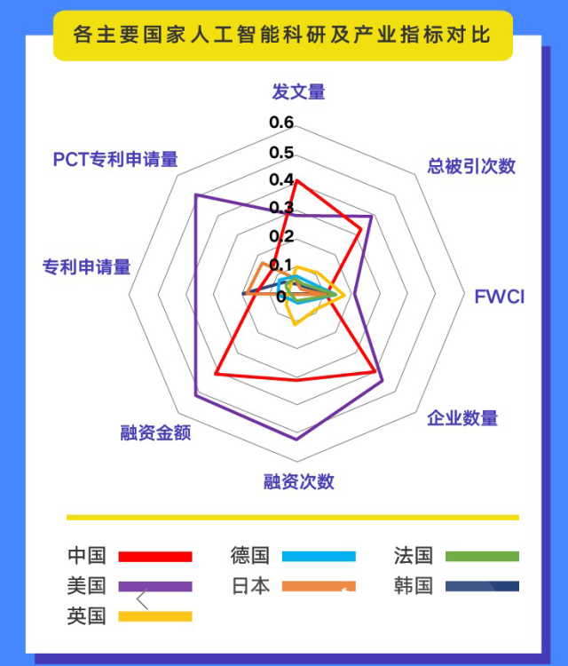 《報告》分析結果顯示,美國、中國、英國在人工智能發展方面表現突出,其它國家也各有特點。美國人工智能論文引文影響力(FWCI)、PCT專利數量、企業數量和融資規模等指標都居全球第一,整體實力領跑全球。中國人工智能論文發文量居全球最高,企業數量、融資規模居全球第二,但引文影響力指標(FWCI)相對落后。英國人工智能論文發文量、總被引次數、企業數量、融資規模等指標排名第三,在全球人工智能領域也具相當實力。以色列雖然論文和企業數量不多,但論文引文影響力指標(FWCI)以及產學研合作指標突出。日、韓兩國在專利申請方面也體現了一定優勢。
