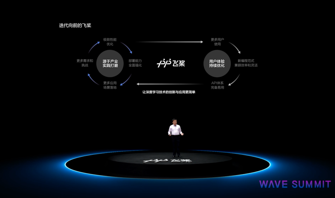 百度集團副總裁、深度學習技術及應用國家工程實驗室副主任吳甜以“蕩起飛槳 AI生產正當時”為主題做了演講。她介紹到,飛槳深度學習平臺作為百度“AI大生產平臺”的基礎底座,以大規模分布式訓練、全硬件平臺支持、端到端全流程工具以及飛槳Master模式,助力企業和開發者加速AI生產。無需從頭學習難度高、迭代快的前沿科技,避免重復“造輪子”,應用AI的門檻更低、成本更低、效率更高。