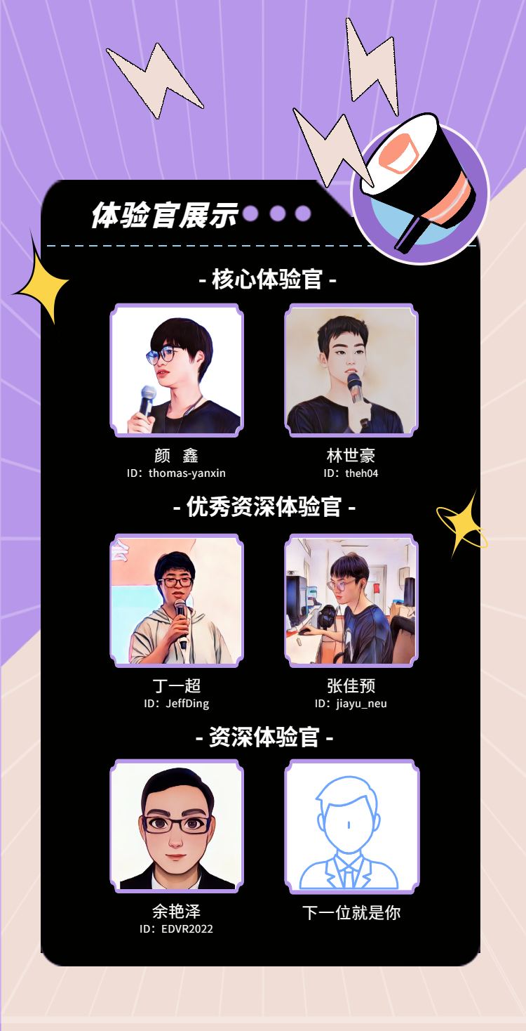 在任期內(nèi),我們將對大家的表現(xiàn)進行評審,通過后予以晉升或授予優(yōu)秀稱號。若資深體驗官任期2年內(nèi)未晉升或獲得優(yōu)秀稱號,將自動離任。優(yōu)秀資深體驗官2次獲優(yōu)秀即可自動晉升為核心體驗官。若核心體驗官2年內(nèi)未晉升或獲得優(yōu)秀稱號,將降為資深體驗官。王牌體驗官亦然。已離任體驗官仍將在官網(wǎng)展示,并標(biāo)注已離任。