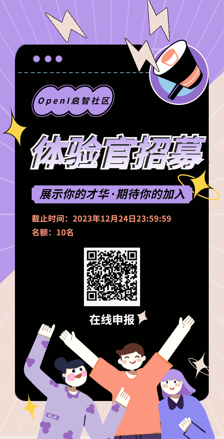 歡迎大家點擊鏈接,或通過掃描下方海報二維碼(也可在公眾號后臺回復(fù)“體驗官”),在線填寫個人資料,加入我們的行列,共同為OpenI啟智社區(qū)的發(fā)展貢獻力量吧!