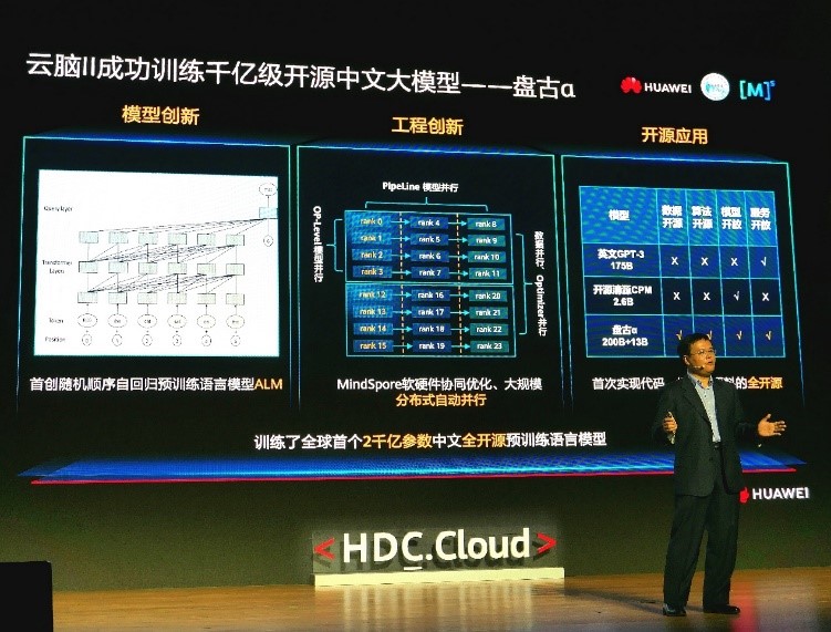 2021年4月26日,在深圳召開的HDC全球開發(fā)者大會上,鵬城實驗室鵬城云腦技術總師、北京大學田永鴻教授發(fā)布了業(yè)界首個全開源2000億參數(shù)中文預訓練語言模型“盤古α”。這是國產(chǎn)全棧式AI基礎設施支持2000億級超大規(guī)模語言模型訓練的第1次,探索并驗證了國產(chǎn)E級智算平臺在軟硬件協(xié)同優(yōu)化、大規(guī)模分布式并行訓練等核心關鍵技術的可行性。代碼、模型、評測數(shù)據(jù)集全部同步在OpenI啟智社區(qū)全面開源開放,訓練語料和在線服務體驗將在測試評估優(yōu)化后開源開放。