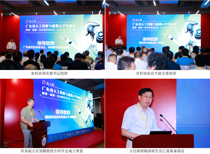 廣東省科協鄭慶順書記、深圳市科協張治平副主席出席并致辭。牽頭發起單位鵬城實驗室常務副主任鄒鵬教授在會上簡要介紹了成立省人工智能與機器人學會的背景以及實驗室在人工智能與機器人領域開展的研究工作。鵬城實驗室主任助理梅濤研究員對省學會的籌備情況進行了匯報。