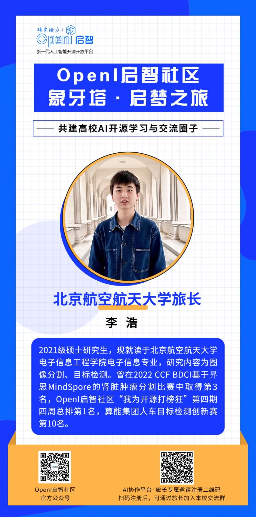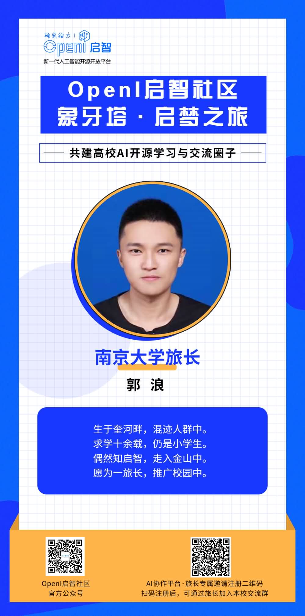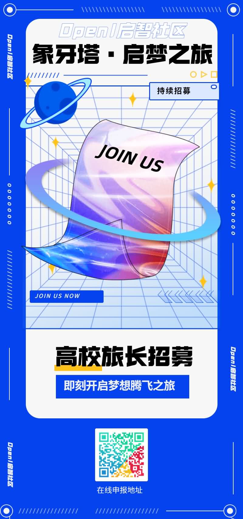 如果你也想成為一名旅長,有意幫助OpenI與本校同學(xué)之間建立更多的聯(lián)系,歡迎通過下方海報上的二維碼進(jìn)行申報。