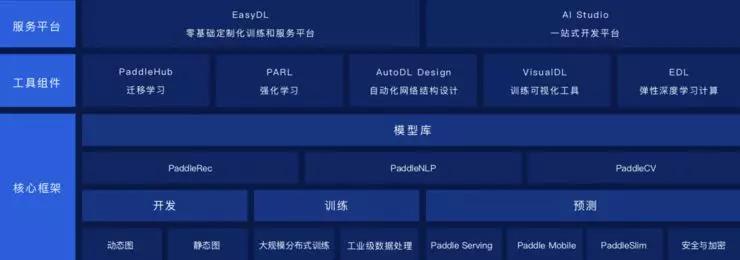 在工具組件上,PaddlePaddle 提供包括遷移學習、強化學習、自動化網絡結構設計、訓練可視化工具、彈性深度學習計算等在內的多個工具組件,適應工業大生產的需要。而在服務平臺層面,PaddlePaddle 則提供零基礎定制化訓練和服務平臺 EasyDL 以及一站式開發平臺 AI Studio。他表示,這一整套的框架和服務,可以幫助廣大開發者和企業利用工具化、平臺化的方式,進一步降低深度學習應用門檻,加速推動產業智能化變革。